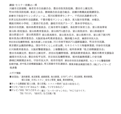 一般社団法人子育て心理研究所 所長日本子育て心理カウンセラー協会 代表日本防犯診断士協会 代表理事講演など過去の経歴