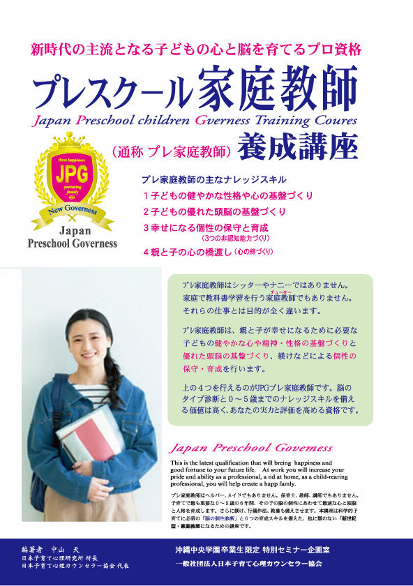 これからはタイプ別育て、そしてプロによる手助けを得て子育てを行う時代7なってきました。親子がこれからの約70年の人生を健やかに、幸せに生きるための生理的な脳・脳機能の基盤形成を手伝うのがプレスクール家庭教師のテーマなのです。